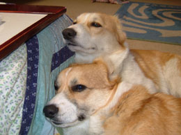 おいかけっこでは、2匹ともバターになるくらい(笑)こたつの周りを回ってます。最後にははぁ〜はぁ〜状態!!